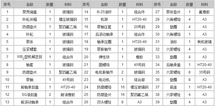 一、FS玻璃钢离心泵产品概述: FS型玻璃钢离心泵,是上海邦泉泵业近几年来研制开发的新产品,结构简单设计合理,标准化程度高,零件通用性,互换性强,拆卸检修十分方便。接触介质的零部件,采用聚乙烯醇缩丁醛改性酚醛玻璃纤维,经高温模压成形的酚醛玻璃钢制件。产品具有轻质、高强、不变形、耐温、耐腐蚀等优良性能。在防腐方面可部分替代含铝不锈钢,钛及钛合金等贵重金属。轴封:采用WB2型外装式F4波纹机械密封,密封性能可靠,使用时间长。泵的传动和旋转方向:泵通过爪型弹性联轴器,由电动机直接驱动,从电动机端看泵为顺时针方向旋转。