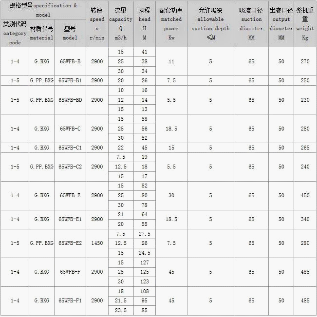 (3)完整的型号书写方式。假设水泵的要求是:造型为推车移动型,材质为增强聚丙烯,吸液口径为50mm,性能分类为AD1。这台水泵的完整型号为“5PP50WFB-AD1” 假设水泵造型是长方形防爆型,其它要求同上,这水泵的完整型号应写为“1.3PP50WFB-AD1” 假设水泵造型是圆锥形防爆型,其它要求同上,这水泵的完整型号应写为“2.4PP50WFB-AD1” (4)水泵的法兰采用中华人民共和国国家标准制造。标准代号GB9115.2-88;GB9115.3-88。非金属材质水泵的法兰压力0.6MPa;金属材质水泵的法兰压力1.0MPa。本公司水泵出厂时,进出液口配一只反法兰。